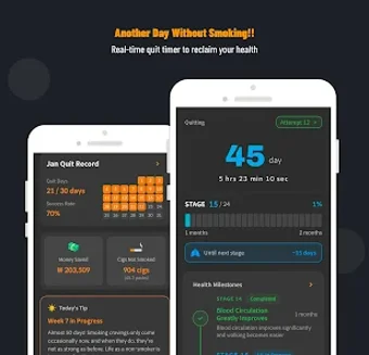 Appen innehåller även funktioner för att spåra besparingar och antal undvikna cigaretter, samt statistik och kalender för att övervaka framsteg. Användare kan anpassa appens utseende med olika teman och färger. Med smarta notifikationer och uppmuntrande meddelanden hjälper QuitSmoke användare att hålla sig motiverade genom hela sin sluta-röka-resa.